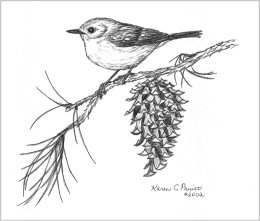 In a departure from her works in watercolor, Karen entered a pen and ink drawing in the 2002 logo contest for the 8th Annual Migratory Bird Celebration. Thousands attended the event at the Chincoteague National Wildlife Refuge. Karen's winning entry of a pine warbler graced the celebration's brochure cover, t-shirts, pins, and advertisements. |